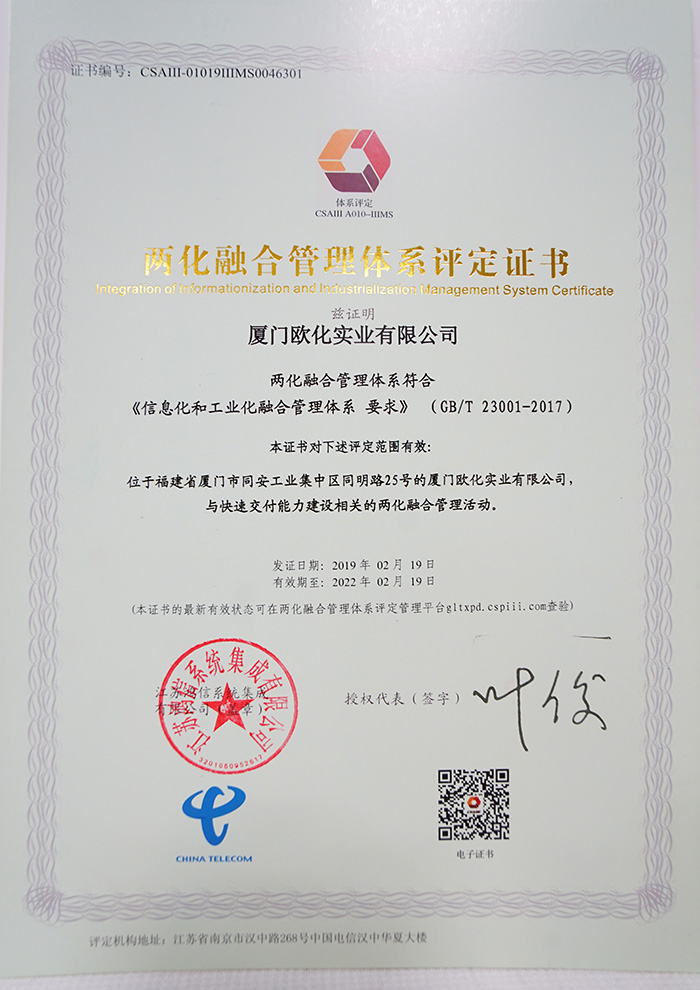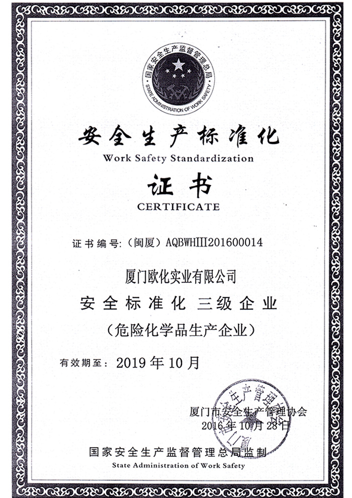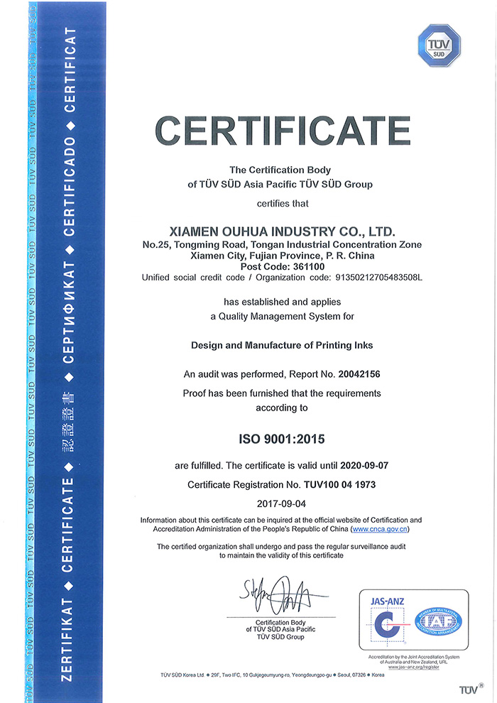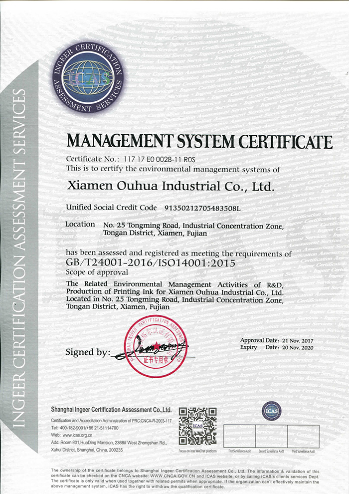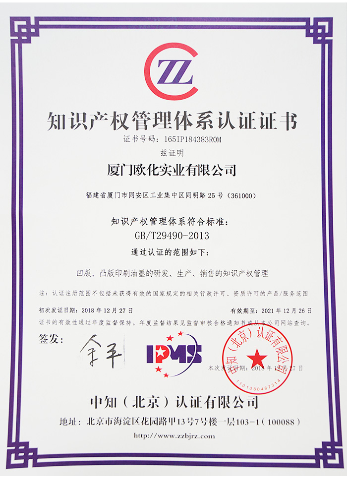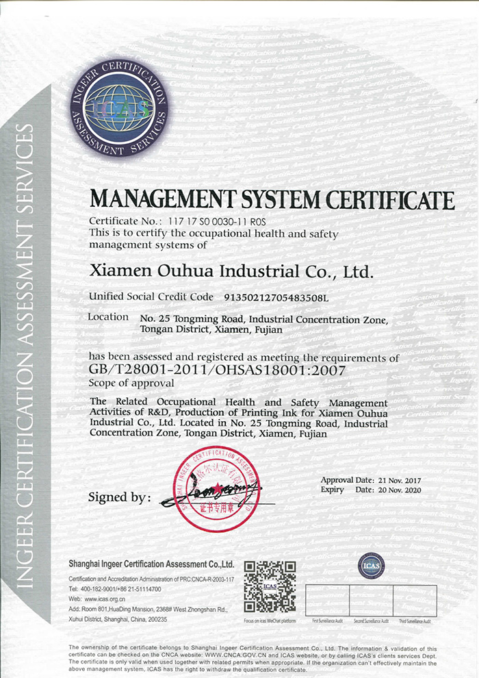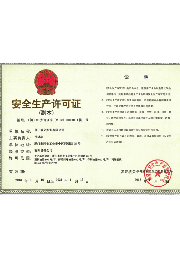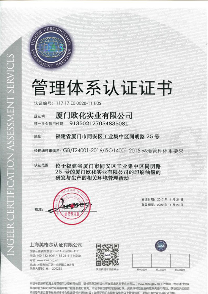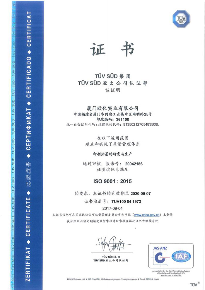 廈門歐化實(shí)業(yè)有限公司創(chuàng)建于二OO一年八月,位于廈門市同安工業(yè)集中區(qū)同明路25號,占地面積超過39000平方米,擁有各種符合國家相關(guān)法規(guī)的甲、乙類生產(chǎn)車間和倉庫,先進(jìn)專業(yè)油墨生產(chǎn)設(shè)備、高新科技實(shí)驗(yàn)設(shè)備200多臺(tái)(套)。公司先后獲獎(jiǎng)國家級高新技術(shù)企業(yè)、國家專精特新“小巨人”企業(yè)、廈門市科技小巨人領(lǐng)軍企業(yè)、廈門優(yōu)質(zhì)品牌等榮譽(yù)。通過ISO9001:2015質(zhì)量管理體系、ISO14001:2015環(huán)境管理體系、ISO45001:2018職業(yè)健康安全管理體系、國家安全標(biāo)準(zhǔn)化三級企業(yè)、知識(shí)產(chǎn)權(quán)管理體系、兩化融合管理體系等認(rèn)證。
