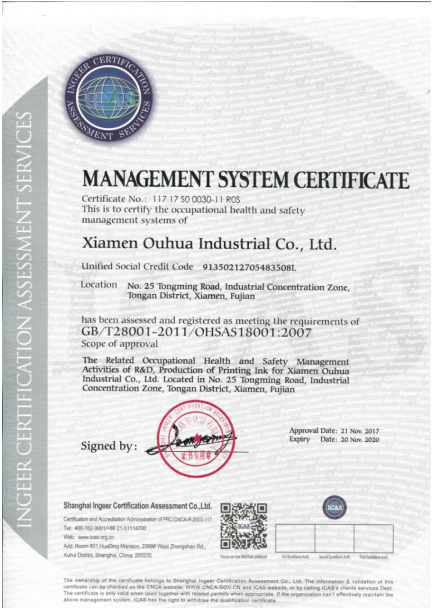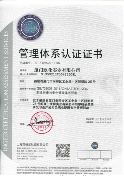 近日,廈門歐化實(shí)業(yè)有限公司的印刷油墨研發(fā)與生產(chǎn)的相關(guān)職業(yè)健康安全管理活動(dòng)通過OHSAS 18001:2007認(rèn)證。